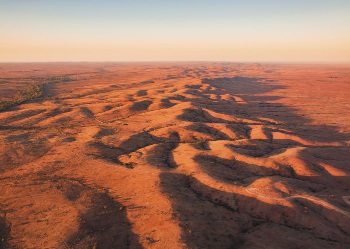 有一種超凡脫俗的感覺蒙迪蒙迪平原(Mundi Mundi Plains)位於新南威爾斯州西部偏遠地區斷背山 (Broken Hill)附近,是一片廣闊的土地。這片平原似乎無邊無際,讓人彷彿置身於地球的邊緣。日落時分,貧瘠的平原披上了柔和的色彩,沙漠的寂靜與美麗令人心曠神怡。